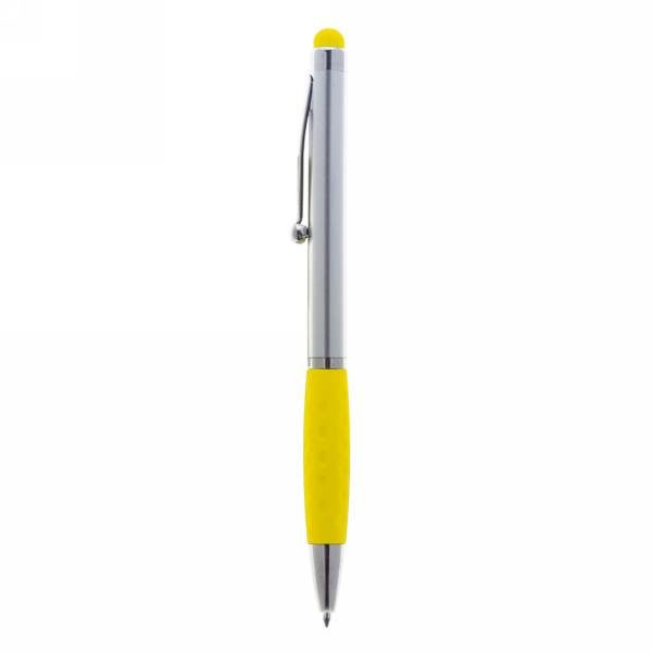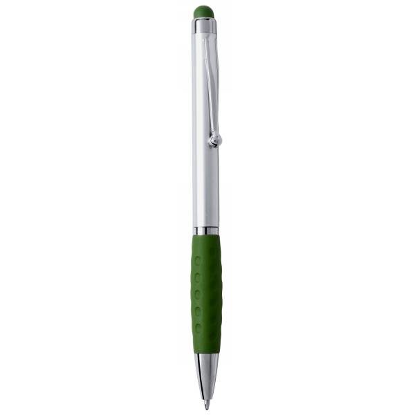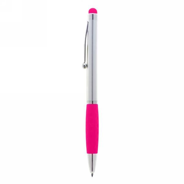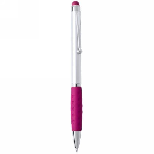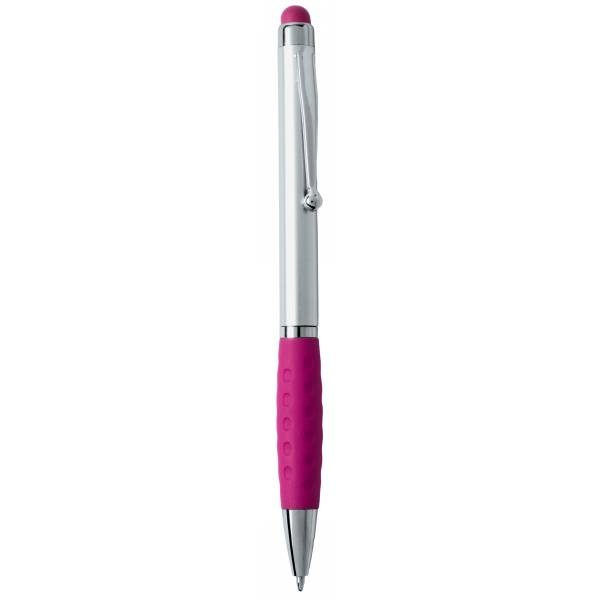 Ball pen, touch pen with silver barrel and coloured rubber tip