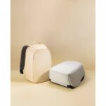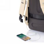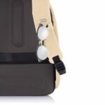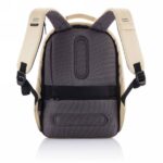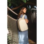 600D 2 tone polyester backpack with fashionable brown details on the handles and zippers.