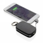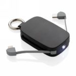 Portable 1200 mAh pocket powerbank that you can take anywhere you go to re-charge your mobile on the go. The powerbank comes with integrated 3 in 1 (IOS, Micro, type C) charging cable so it can charge any device on the market directly. Made from ABS material with TPE cables. The portable powerbank has a strong carabiner ring to attach to either your keys or a bag. Including torch with strobe function. The powerbank contains a long-lasting grade A 1.200 mAh lithium polymer battery. Input 5V/1A; Output 5V/1A. Including PVC free TPE material micro USB cable.