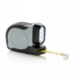 Large ABS measuring tape with 2 functions. The tape has a 5m/19mm steel retractable tape with push button lock mechanism. On the front is super bright white led light that can be switched on and off with the push button on top. On the backside, there is a belt clip. Includes batteries for direct usage. _x000D_