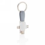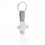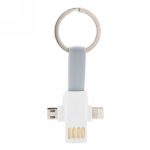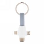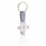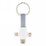 Keychain cable with 3 different connectors: micro USB, type C and a double sided connector for IOS and Android devices. Suitable for charging and syncing data. Both ends can be connected by magnet to keep the cable compact and easy to carry.