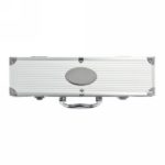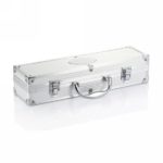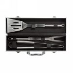 3 pcs stainless steel barbecue set including, spatula, carving fork with protection cover and pair of tongs, stainless steel handles. Packed in aluminium case with handle and hinges.
