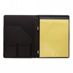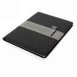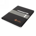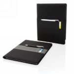 This RPET portfolio provides an elegant holder for your business cards, notes and papers; it includes 4 cardholders, a slot for your papers, 2 pen loops and a A4 size 20 sheets lined 70 grams white recycled paper notepad.