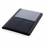 A4 portfolio with 2 useful front pockets and large front sleeve. Inside with sleeve for documents, 4 card holders and pen loop. Including recycled A4 notebook.