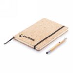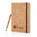 ECO notebook made out of natural cork with 160 pages of 80g. With black page divider and black elastic band. Including bamboo pen with stylus tip and ballpoint.