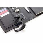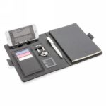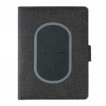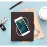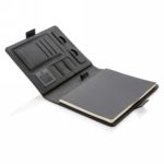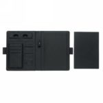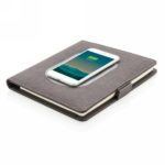 This notebook cover with removable notebook (128 lined pages of 80 g/m2) boasts the latest technology. The front cover has a wireless charging pad for your phone. (Android latest generations, iPhone 8 and up). Older phones and tablets can be charged via the USB ports from the 4.000 mAh powerbank. The unique USB ports pop up with a simple click of a button. Input: 5.0V/1.0A. Output: 5.0V/2.1A. Wireless Output: 5W. Registered design®