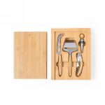 Bamboo wine and cheese set in bamboo box, bamboo cheese board, 4 pcs. cheese knife, cheese spatula, waiter’s knife, bottle stopper