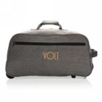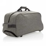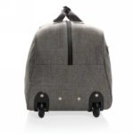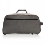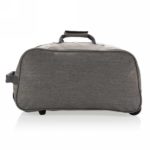 600D high density extra strong two tone polyester fabric. With extendable trolley system. One front pocket and one zipper closure main compartment.