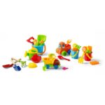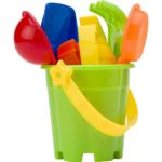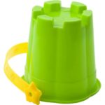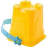 Beach bucket in 4 different colours and shapes – 2 round, 1 square and 1 octagonal, inside: shovel, fork, scoop, sand strainer and 2 modelling parts (fish and crab shapes), mix 4 patterns assorted