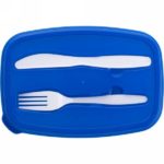 Zipped cooler bag with carry handle, includes lunch box 1,2 L with two compartments, knife and fork attached on matching colour lid.