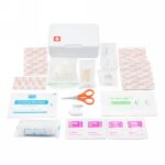 First aid kit in plastic case, inside: plasters 72×19 mm (10 pcs), plasters 56×19 mm (5 pcs), plasters 40×10 mm (5 pcs), plasters Ø22 mm (5 pcs), flexible plasters 76×38 mm (2 pcs), alcohol pads 3×6 cm (6 pcs), non-adherent pads 5×7,5 cm (2 pcs), non-woven tape 1,25 cm x 4,5 m (1 pc), PBT bandage 7,5 cm x 4 m (1 pc), scissors (1 pc), antiseptic cleansing wipe 2×20 cm (4 pcs), cotton buds (10 pcs/bag), safety pins (10 pcs), disposable gloves (1 pair), non-woven wound dressing 5×9 cm (1 pc)