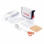 Pouch with one front pocket, one black zipped main compartment and belt loop on reverse side of pouch. Content: triangle bandage, PBT bandage, alcohol pad, plasters, scissors, pin and tape, conform EN 13485:2003.