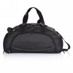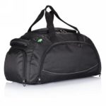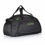 600D ribstop, zippered front pocket with organizers inside, side pocket, shoe pocket, webbing handles and shoulder strap, 4 stand feet on base, PVC free.