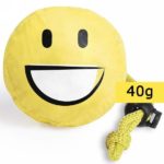 Foldable shopping bag “smiling face”, folded into corner with string and plastic stopper