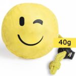 Foldable shopping bag “smiling face”, folded into corner with string and plastic stopper