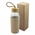 Glass sports bottle 410 ml with pouch, bamboo lid with handle
