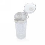 Add some healthy fruit flavours to your water. This design bottle with honeycomb details offers convenient single-handed drinking. Push the button and the lid flips open. There’s a special locking mechanism to keep users from accidentally pressing the button. Including carrying handle. This infuser bottle is made of a durable and innovative tritan material . Odourless and 100% BPA-free. Content 700ml. Registered design®