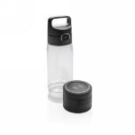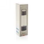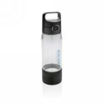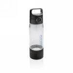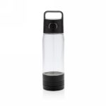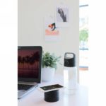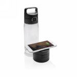 Leak proof tritan bottle with lock and handle. Content: 600 ml. Including 5000 mAh wireless powerbank in base. Compatible with all QI enabled devices like Android latest generation, iPhone 8 and up. Input: 5.0V/1.0A. Output: 5.0V/2.1A. Wireless Output: 5W. Registered design®