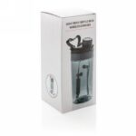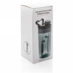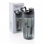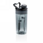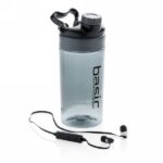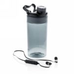 Leakproof tritan bottle with unique lid incorporating easy carry handle. Sweatproof wireless Bluetooth 4.0 earbuds inside. 55 mAh battery inside for 3 hours of music. Includes microphone, phone pickup function and volume control. Includes micro USB cable. Content 500ml.