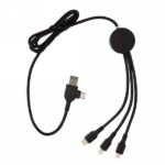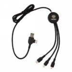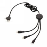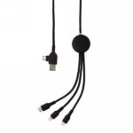Braided nylon multi cable with 5 different connectors: USB C in, USB A in, type C out, IOS out and micro USB out. This allows you to use the cable also with type C output devices that are included in the newer generation of phones and macbook computers. The cable also has a USB A output input option so it can charge any device from any output source. ABS casing with option to engrave your logo that will light up when the cable is being used. PVC free. Lenght 120 cm.