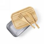 Lunch box 600 ml made of stainless steel with bamboo lid, including fork and knife, combined with strap