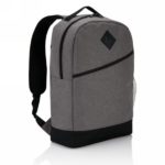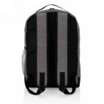 Modern 600D 2 tone polyester backpack with a zippered main compartment, a velcro front compartment, a side mesh pocket and adjustable padded shoulder straps. Air mesh padded back panel. PVC free.