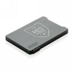 This card holder can hold a maximum of 4 cards or 3 embossed cards. Its designed to block RFID readers from electronic pickpocketing. The slider on the side will push the cards up. Registered design®
