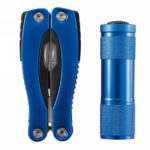 Set with 14 functions, stainless steel multitool with aluminium anodized handle and aluminum torch with 9 white LED’s.