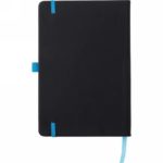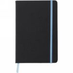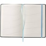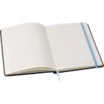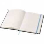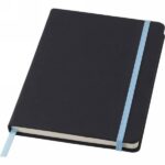 Notebook (approx. A5, 96 lined sheets), elastic band for closing and ribbon marker, engraving shows surface in elastic band colour