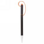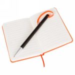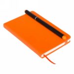 Notebook (approx. A6, 96 lined sheets), hard cover, ribbon marker and ball pen, touch pen with cap on elastic ribbon that can be attached to notebook