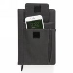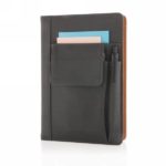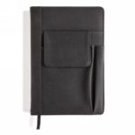 Coated pu notebook cover with a front phone pocket (14 x 10cm), pen pocket and one main pocket . Black page divider and 160 pages of 80g/m2 Inside. This notebook cover can be re-used with new A5 notebook paper for endless writing.