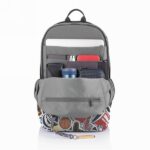 1680D and jacquard backpack. Zippered front pocket with organizer. Zippered main compartment with 15,6” padded laptop pocket. Reflective piping. Two side mesh pockets. PVC free.