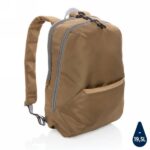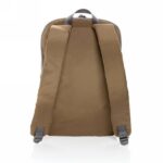 600D 2 tone polyester backpack with fashionable brown details on the handles and zippers.