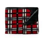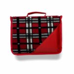 Fleece picnic blanket with plastic back, folded and packed in pouch with handle