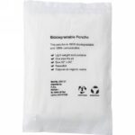Foldable poncho with hood in transparent casing, made of compostable PLA