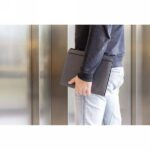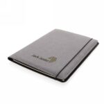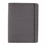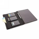 The recycled leather portfolio adds a little bit of extra sophistication to your work. Keep your important documents, cards and notes together in this beautiful portfolio with black elastic binder. Inside the A4 portfolio you can find a lined 64 gm/2 recycled paper notepad containing 20 pages. Inside there’s 1 big sleeve pocket, 3 phone size pockets and 4 business card slots.