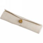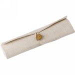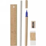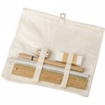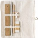 School set in cotton pouch, pencil, ball pen, sharpener, eraser and bamboo ruler 15 cm