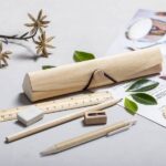 School set in wooden box with elastic closure, ball pen with recycled cardboard barrel and wheat straw details, wooden pencil (unsharpened), wooden ruler (15 cm / 6 inch), wooden pencil sharpener, eraser