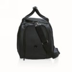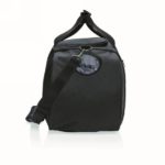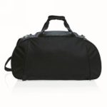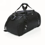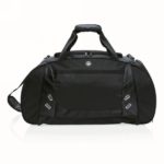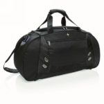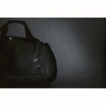 Sports, travel bag, made of 600D and 1680D polyesters, roomy main compartment with U shaped top closure, air vented side shoe compartment, zippered front pocket for small accessories, double handles, adjustable shoulder strap, PVC free