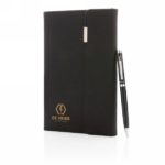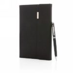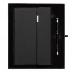 This notebook and pen set is a fantastic choice for those wanting to look sleek and sophisticated at the office. The notebook features a rich texture PU cover with metal logo, with 80 sheets/160 pages 80 grms lined cream colored paper. The pen comes with German ink and offers 1200 metre writing length. Packed in luxury sleeve gift box.