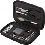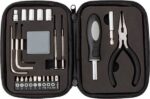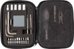 Tool set, 24 pcs: 5 sockets, 3 hexagonal screwdrivers, 9 screw bits, 1 socket, 1 measuring tape, 2 precision screwdrivers, 1 screwdriver handle, 1 extension bar, 1 set of pliers, in zipped leather case
