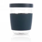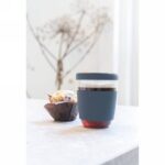 Enjoy your coffee at work or at home in this Ukiyo borosilicate glass with silicone lid and sleeve. The cup has a nice grip and a slim shape. A small vent in the lid allows steam to escape to prevent pressure build-up. BPA free. Capacity 360ml.