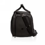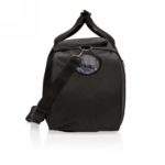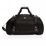 This 600D with 1680D polyester duffle bag offers sporty style for the gym or casual travel. Includes a roomy main compartment with a U-shaped top zipper closure, a side entry shoe compartment with air vent and a side bottle holder compartment. Front zippered quick-stash pocket for smartphones and other travel accessory. Adjustable shoulder strap and double top handles for carrying comfort and versatility. PVC free.