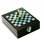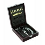Wine set 5 pcs in wooden box, chess game and wine accessories: thermometer, bottle ring, stopper, waiter’s knife