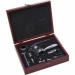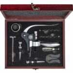 Wine set 7 pcs in wooden box, including: 2 bottle stoppers, ring, thermometer, foil cutter, funnel and corkscrew