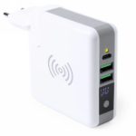 Wireless power bank 6700 mAh, travel adapter, wireless charger 5W, works with mobile phones with inductive charging function, USB type C 5V/3A input, 2 USB outputs 5V/2.4A, USB type C output 5V/2.4A, plugs for USA, Australia, UK, Asia and Europe