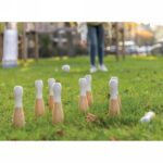 Get ready to aim with this beautiful crafted skittles set made from pine wood. Skittles is fun for both adults and children. Play at home with family, in a park or challenge the guest of your party. Easy set up- just set up the pins, set a throwing point and you are ready to go. The set includes 9 pins and three balls. Presented in a cotton pouch with rule book.