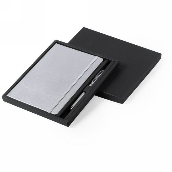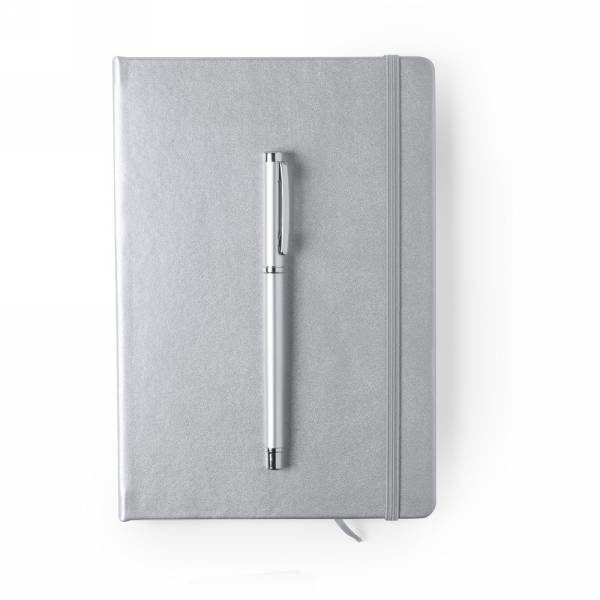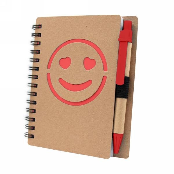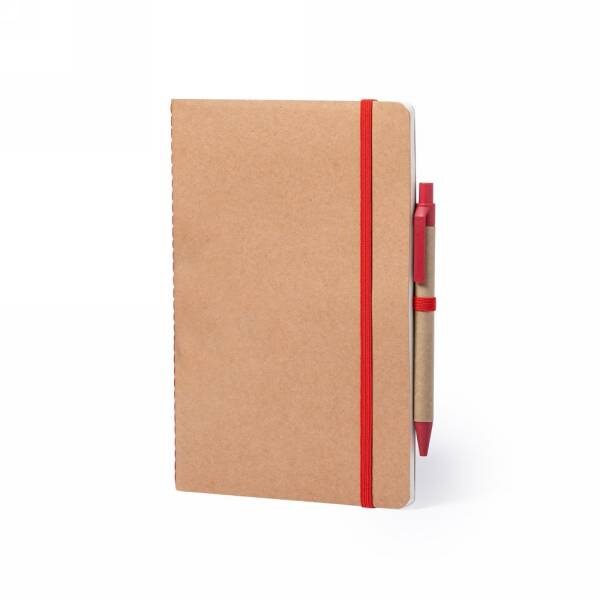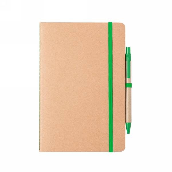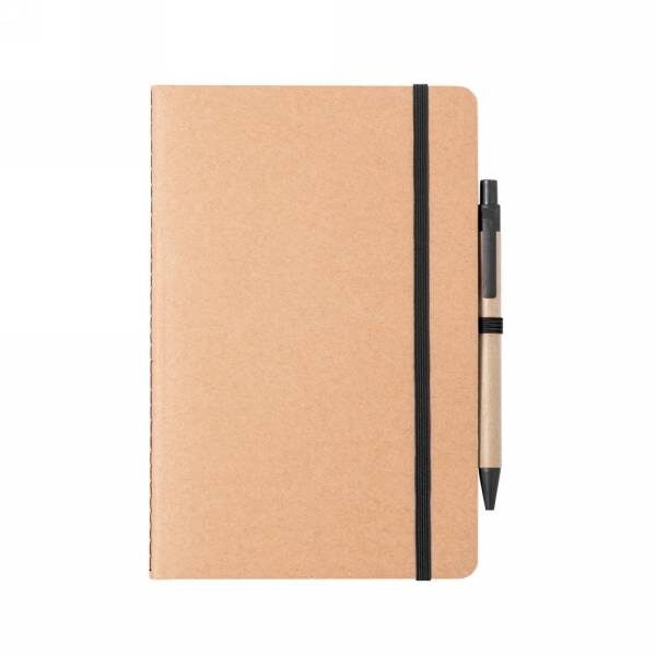 Notatnik A5 (60 pustych kartek) z kartonu z recyklingu, miękka okładka, elastyczna opaska do zamykania, długopis z korpusem wykonanym z kartonu z recyklingu oraz elementami ze słomy pszenicznej i ABS w komplecie