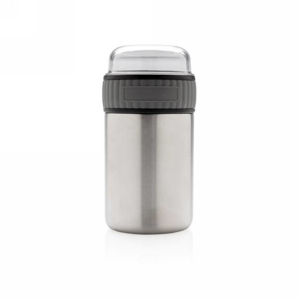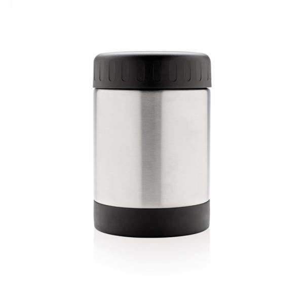 Próżniowy pojemnik na żywność 500 ml, podwójne ścianki, wnętrze ze stali nierdzewnej 18/8, szczelny, powlekany proszkowo czarny kolor cechujący się niezwykłą trwałością i odpornością na wyblaknięcie czy popękanie, ściana wewnętrzna pokryta miedzią o wysokim poziomie przewodnictwa, utrzymuje temperaturę napojów ciepłych do 8 h oraz zimnych do 24 h, łyżka ze stali nierdzewnej 18/8 w komplecie, wyłącznie mycie ręczne