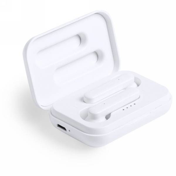 Bezprzewodowe słuchawki douszne TWS (True Wireless Stereo), BT 5.0, wykonane z ABS pochodzącego z recyklingu, posiadają certyfikat RCS (Recycled Claim Standard), który jest stosowany gdy produkt jest wykonany częściowo lub w całości z materiałów pochodzących z recyklingu, funkcja odbierania połączeń, etui z wbudowanym akumulatorem 300 mAh pełniące funkcję stacji ładującej w komplecie, akumulator słuchawek o pojemności 40 mAh umożliwia odtwarzanie muzyki do 4 godzin, ponowne naładowanie za pomocą etui w 1,5 godziny, zasięg do 10 metrów, kabel wykonany z TPE z recyklingu bez dodatku PVC w komplecie, nie zawiera PVC